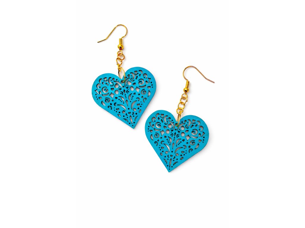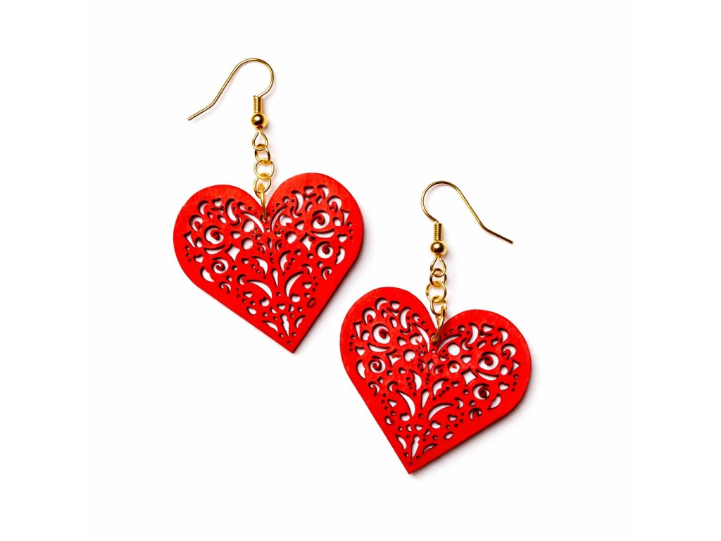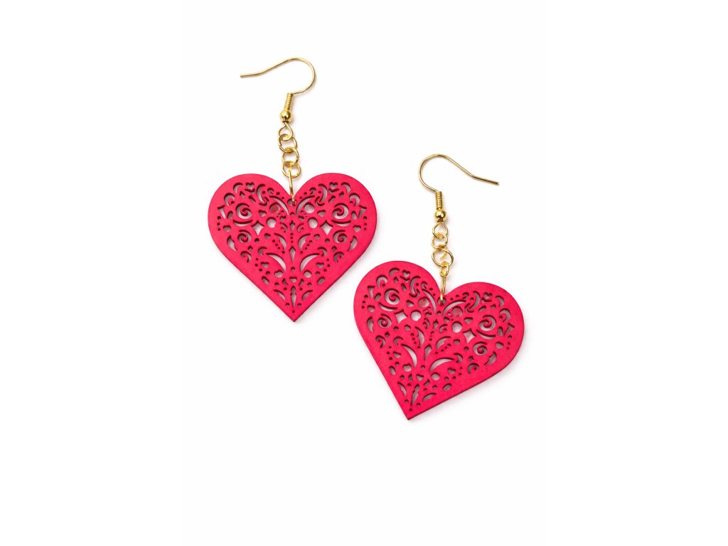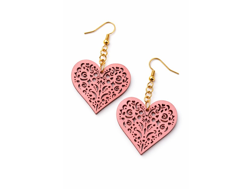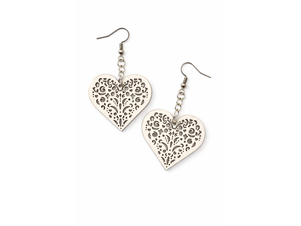 Jemné náušnice z 1,5mm tenké lipové překližky ve tvaru srdce - lehké, romantické a příjemné na nošení.